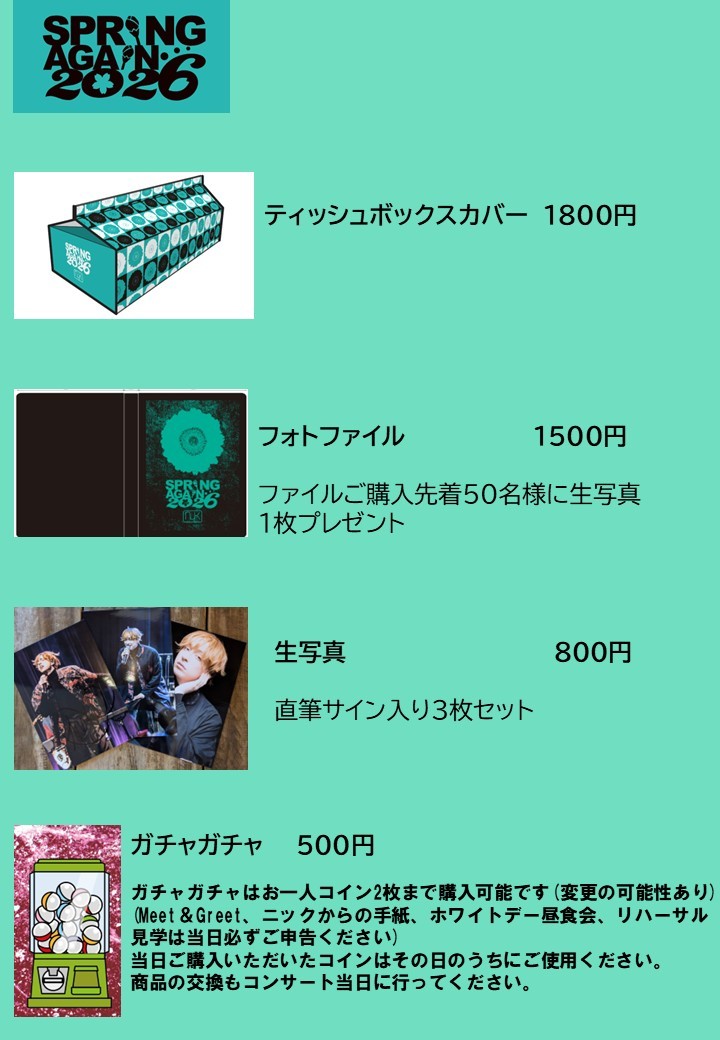 ●ガチャガチャはお一人コイン2枚(変更の可能性あり)まで購入可能です。(Meet&Greet、ニックからの手紙、ホワイトデーイベント、リハーサル見学は当日必ずご申告ください)当日ご購入いただいたコインはその日のうちにご使用ください。